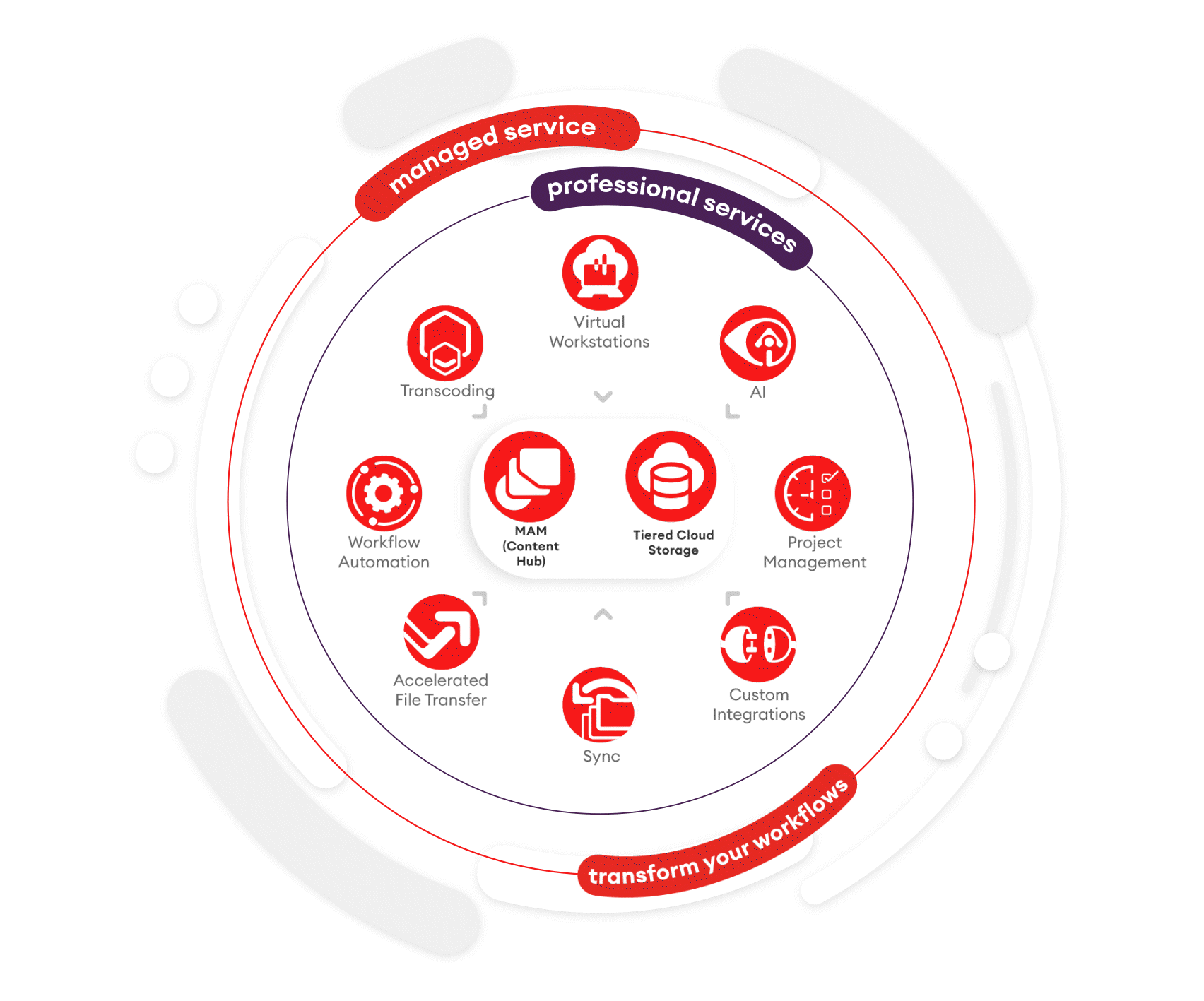 We consolidate media assets that are saved disparately on hard drives and/or shared online storage and a variety of legacy formats. We then help migrate it all in secure cloud storage, index the files with metadata, and design media workflows to include third-party software integrations. This is wrapped up with our professional and managed services as part of our one-provider model.